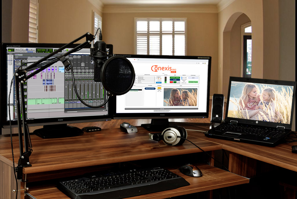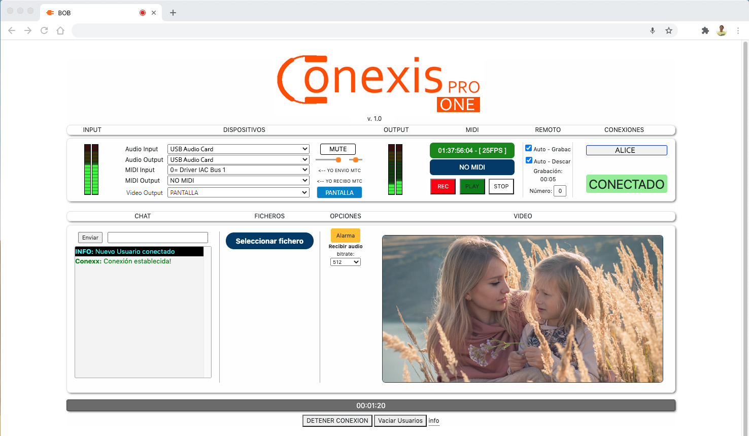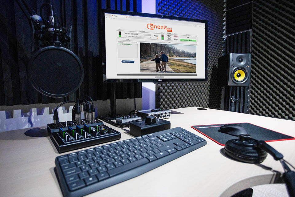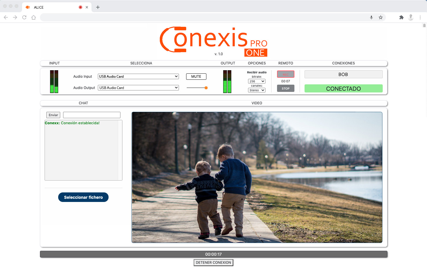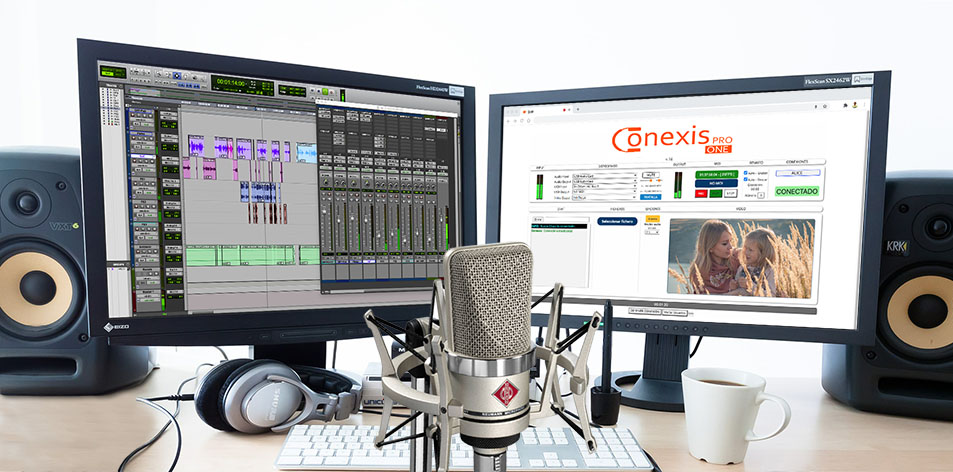 Conexis-Pro ONE es una web-app que permite el envío y recepción de audio a través de internet en la máxima calidad. El códec de compresión de audio es OPUS (muy por encima de MP3) con una tasa de bits de hasta 512kbps en estéreo